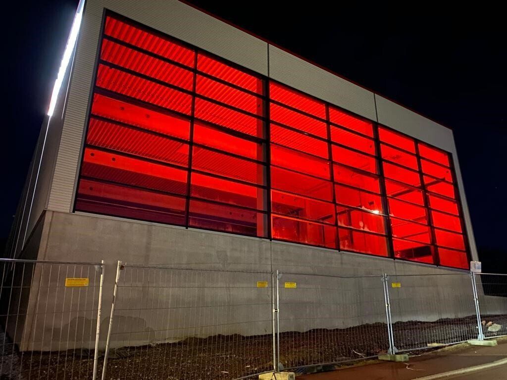 Merkmale: Zur Leimbachstraße besteht die Fassade aus einer segmentierten Pfosten-Riegel-Konstruktion. Die gesamte Fassade verläuft abgeschrägt, entsprechend der Dachneigung und ist mit Sonnenschutzglas ausgestattet.